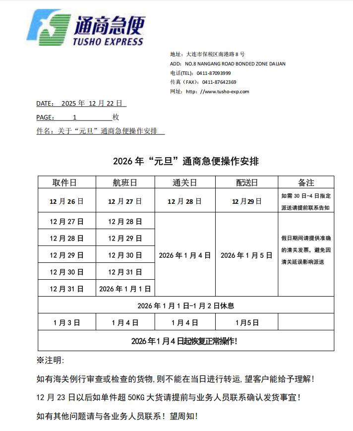 26年元旦通商操作安排